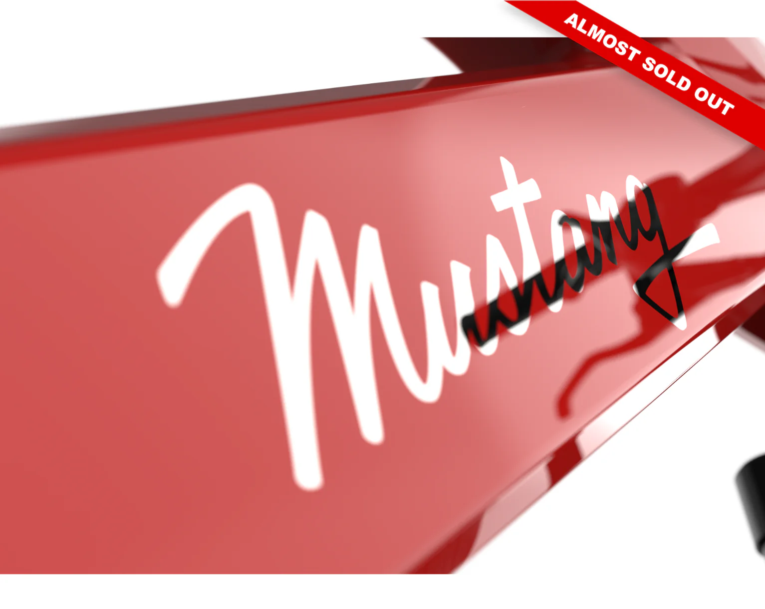Powered by a 48V, 15Ah | 720Wh battery, the Mustang electric bike can cruise up to 60 miles ***, and riders can take advantage of four power power modes – Eco, Normal, Sport, and Track.